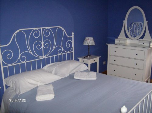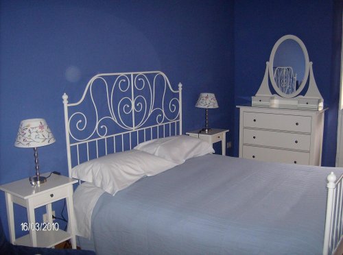 Синий номер располагает кроватью из белого кованого железа, белыми тумбочками, креслом, комодом с овальным зеркалом и ящичками, цветным телевизором, ванной комнатой.